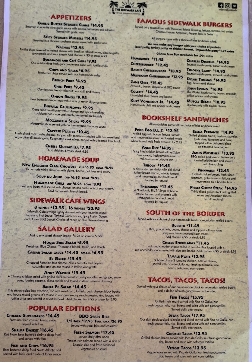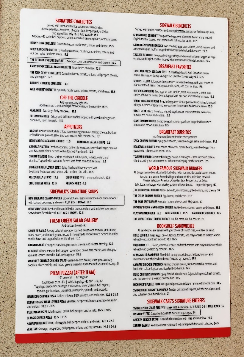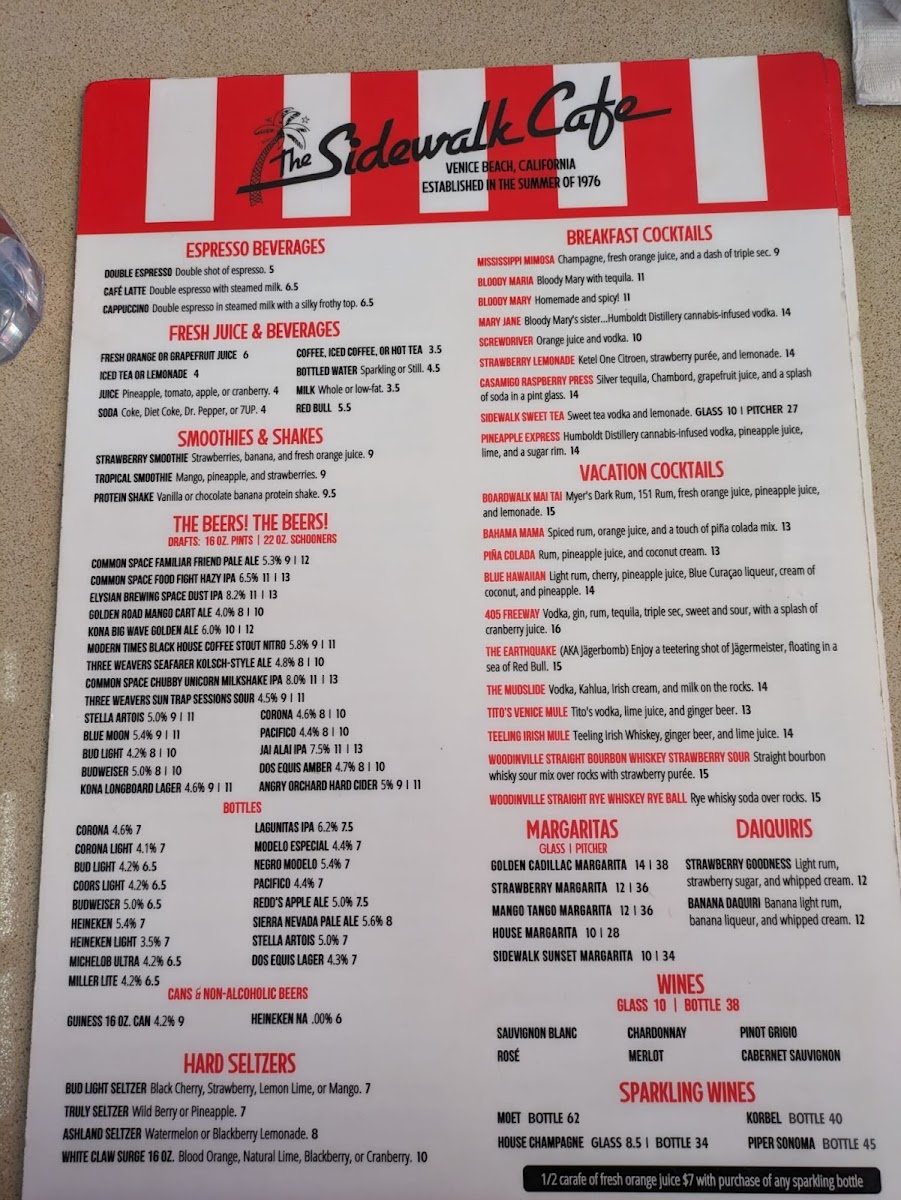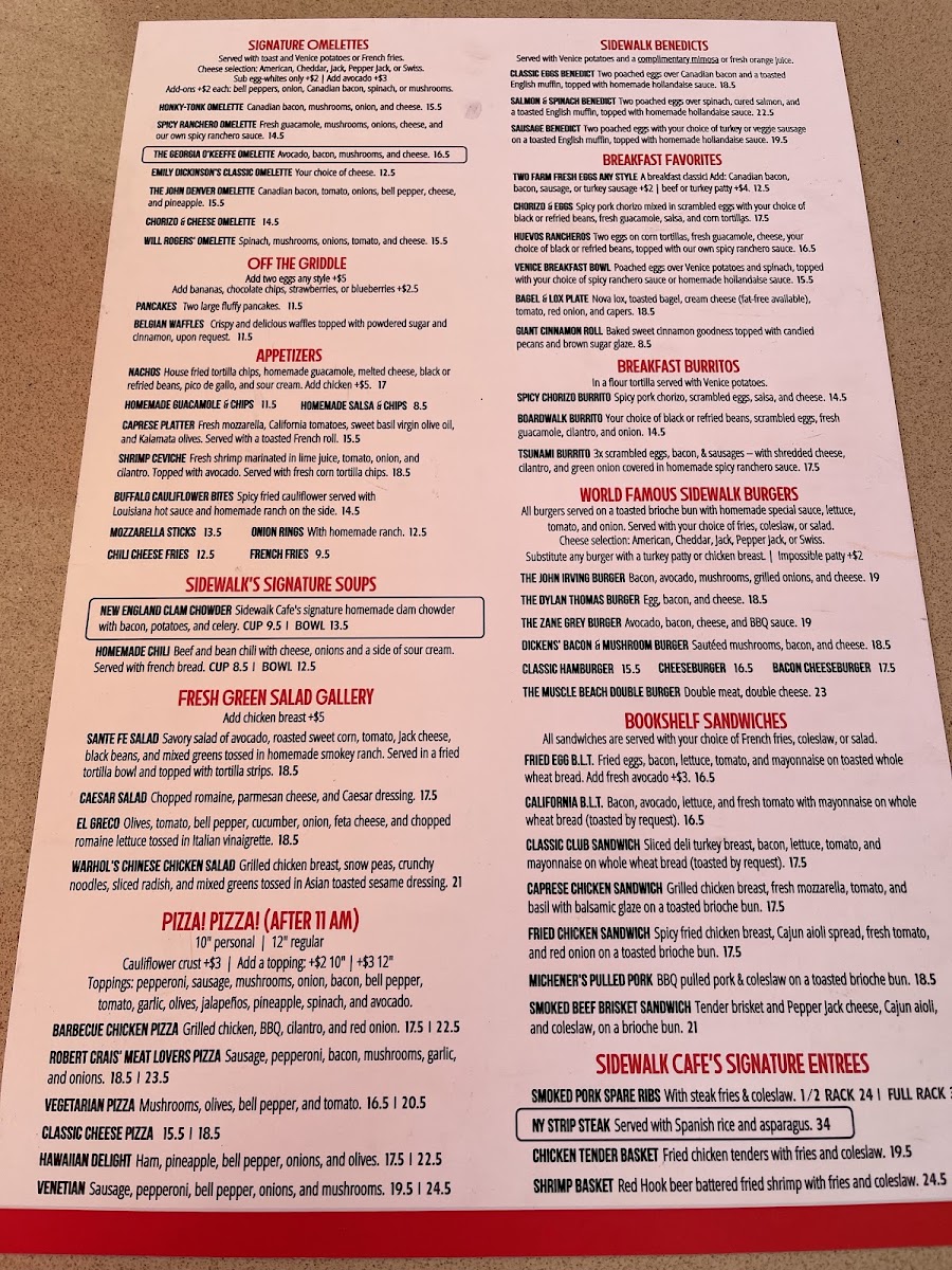 The Sidewalk Cafe offers a vibrant menu rooted in classic American bar & grill favorites, perfectly suited for its iconic Venice Beach locale. Start your day with the Off the Griddle selections—fluffy pancakes, crispy Belgian waffles dusted with cinnamon and powdered sugar, or hearty breakfast burritos like the spicy chorizo or the loaded Tsunami Burrito enveloped in a zesty ranchero sauce. For brunch lovers, the Mimosa Benedicts are a standout with options like the rich Salmon & Spinach Benedict topped with homemade hollandaise.