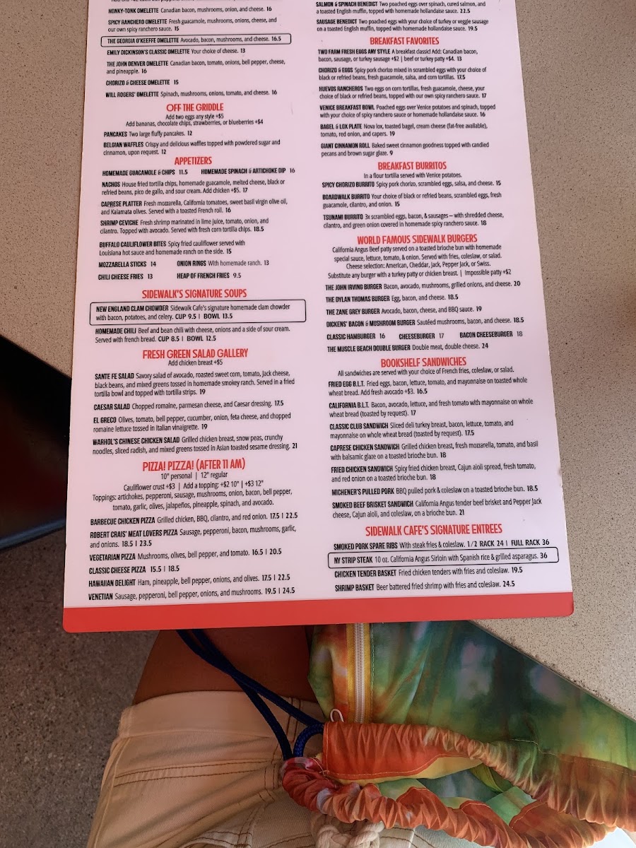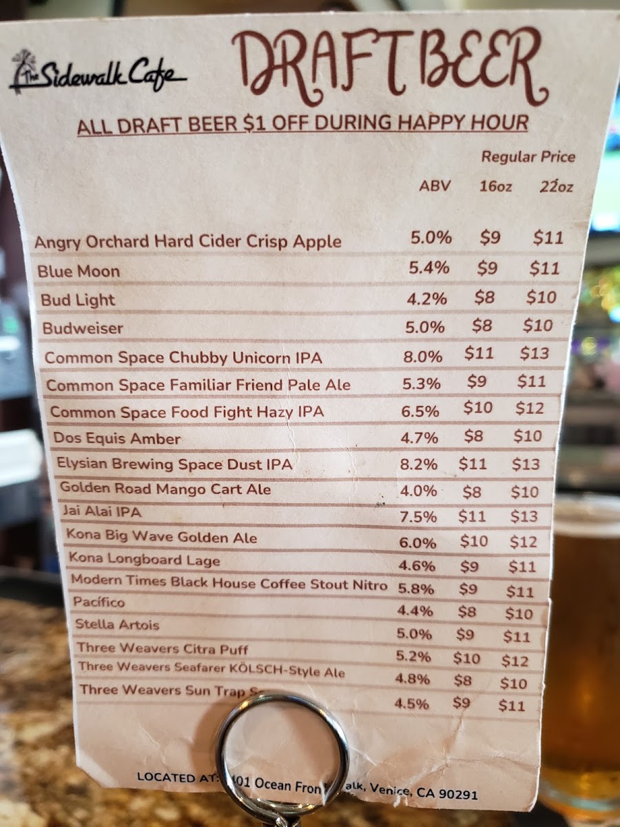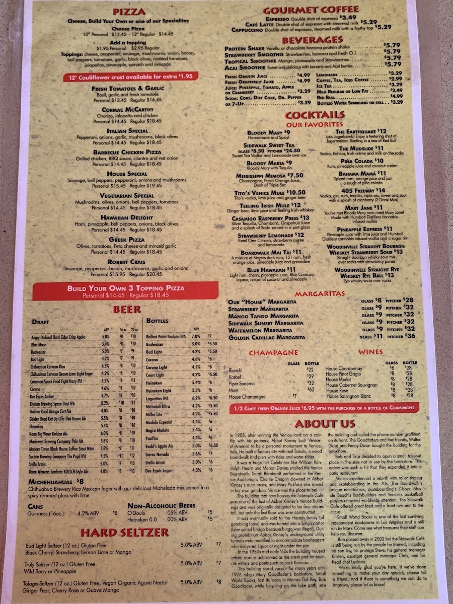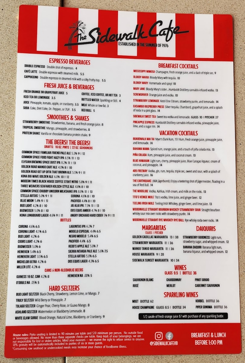 The Sidewalk Cafe offers a vibrant menu rooted in classic American bar & grill favorites, perfectly suited for its iconic Venice Beach locale. Start your day with the Off the Griddle selections—fluffy pancakes, crispy Belgian waffles dusted with cinnamon and powdered sugar, or hearty breakfast burritos like the spicy chorizo or the loaded Tsunami Burrito enveloped in a zesty ranchero sauce. For brunch lovers, the Mimosa Benedicts are a standout with options like the rich Salmon & Spinach Benedict topped with homemade hollandaise.